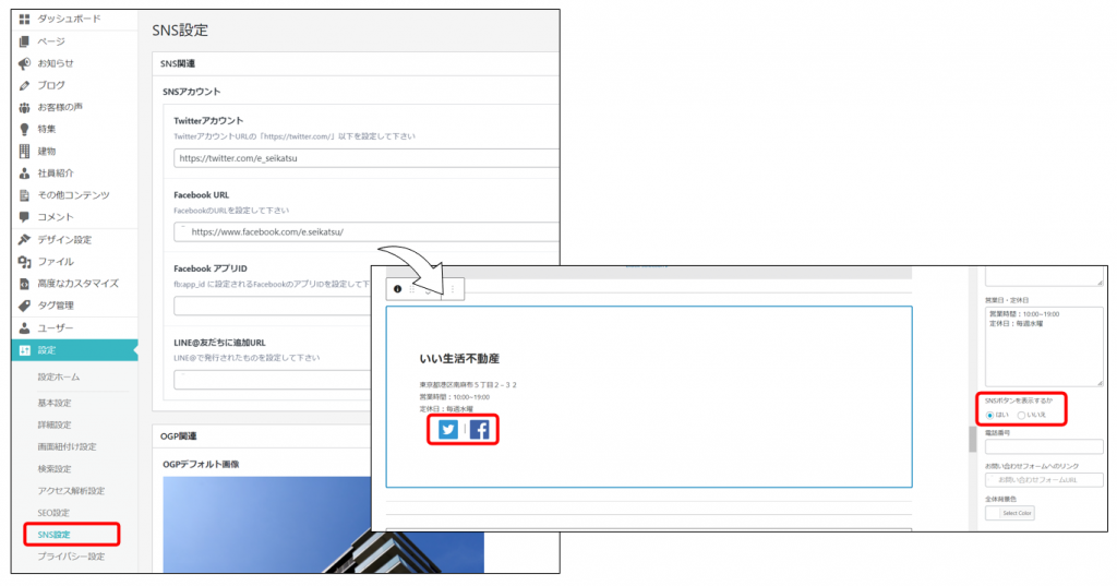 「お問い合わせ先」ブロックや「SNSリンク」ブロック等を利用する際に、サイト設定で設定したSNSアカウントへリンクします。