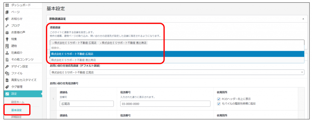 および一般問い合わせページや借りたいお客様向け問い合わせページ等の各問い合わせページの送信先店舗を設定することができます。