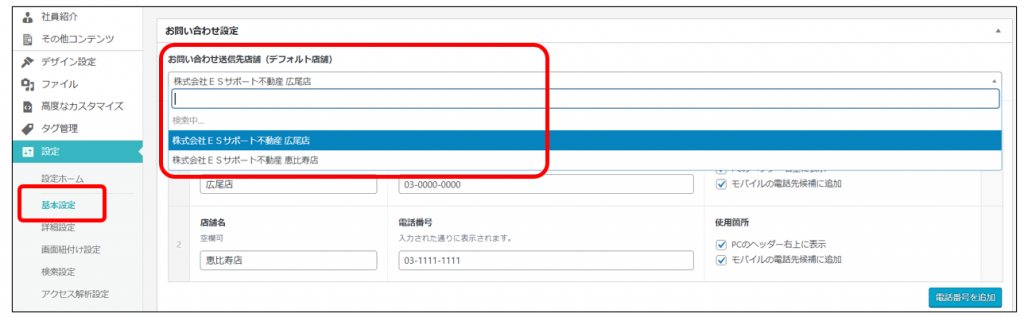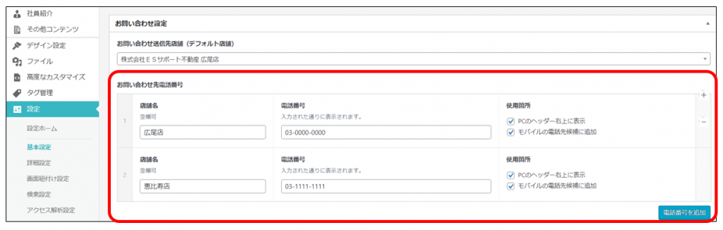 お問い合わせ先電話番号:PC・スマホサイトに表示される電話番号を複数設定できます。
