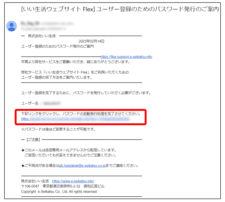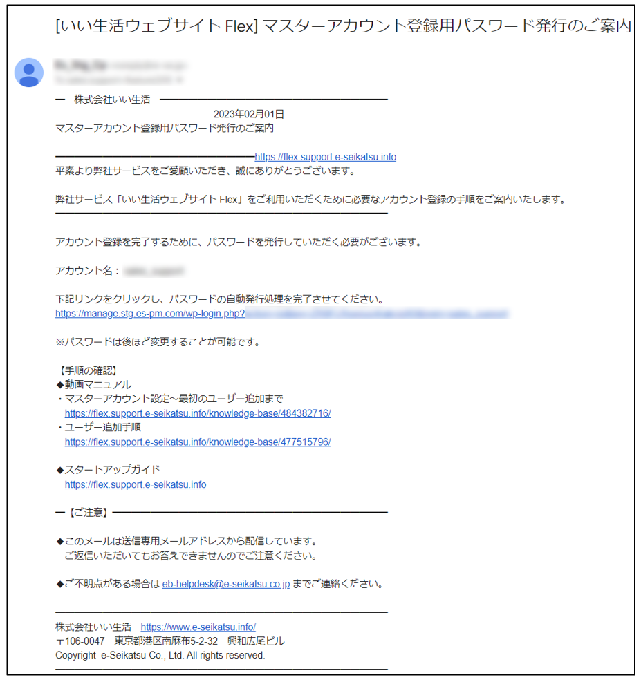 件名:ウェブサイトFlex マスターアカウント登録用パスワード発行のご案内