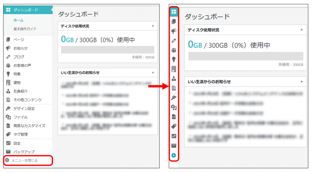 「メニューを閉じる」をクリックすると、メニューがアイコン表示になります。