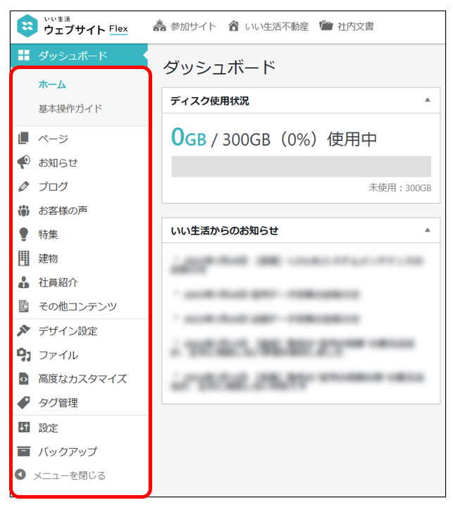 管理画面の左側に表示されるメニューからサイト全体や各種ページの設定を確認・編集することができます。