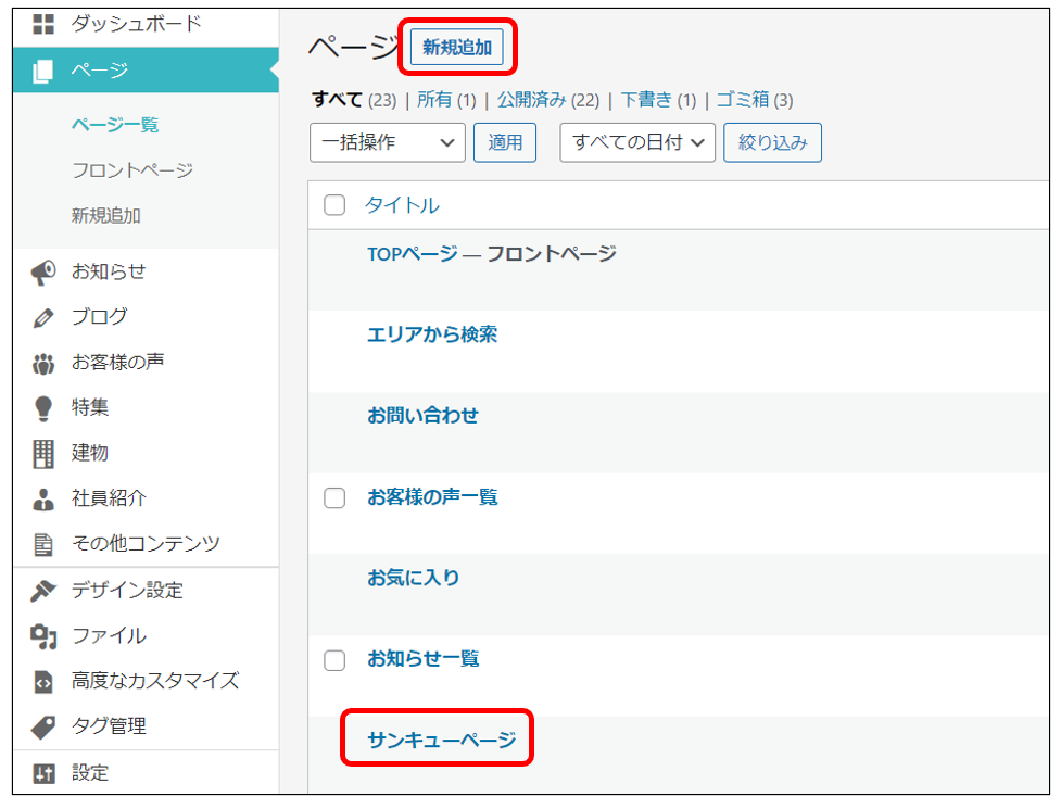 サンキューページは左メニューの「ページ」より追加・編集できます。