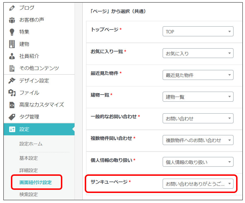 ※サンキューページが1種類のみで良い場合は、こちらの画面紐付け設定だけ設定してください。