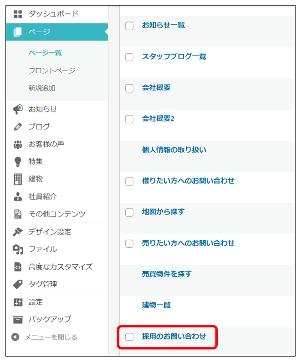 左メニューの「ページ」や「共通レイアウト」からお問い合わせフォームの編集画面を開きます。