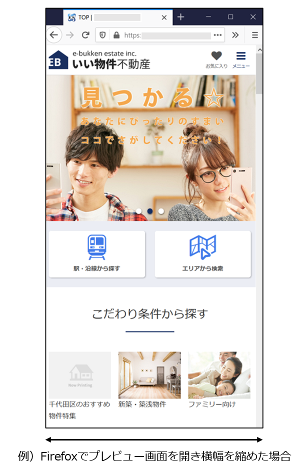Firefox等のブラウザでサイトを表示して、ウィンドウを縮小することでスマホで表示した際の見え方をご確認いただけます。