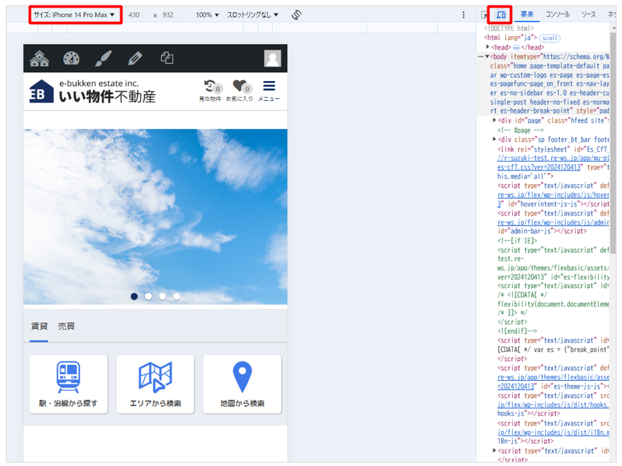 「サイズ」から確認したい画面サイズに切り替え、ページの再読み込みを行うと表示を確認することができます。