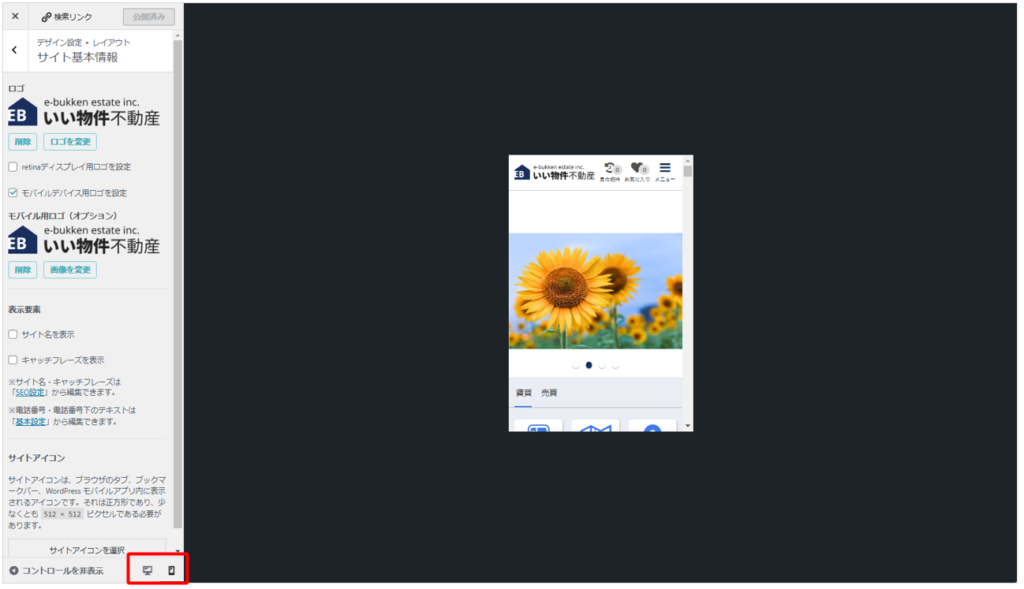 メニューからデザイン設定画面を開き、左下に表示されるモバイル表示をクリックすると、右側のプレビューがモバイル版の表示に切り替わります。