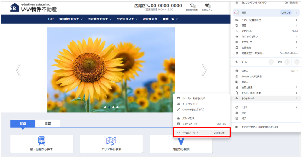 ブラウザでchromeを利用している場合には、「デベロッパーツール」を用いてスマホでの見え方を確認することができます。
