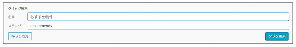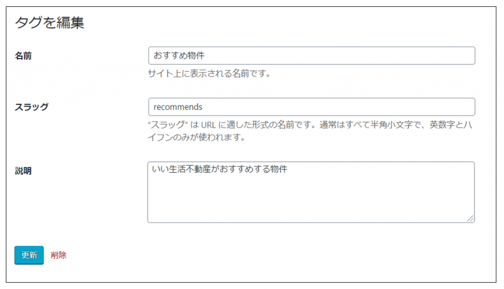 | スラッグ | タグを識別するために使います。 半角英数字とハイフンのみ使用可能です。 既に同じスラッグを持つタグがある場合は作成できません。 |