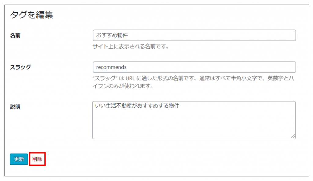 また、編集画面の「削除」からもタグ削除が可能です。