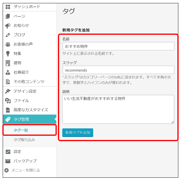 「新規タグを追加」をクリックし、タグを新規作成できます。