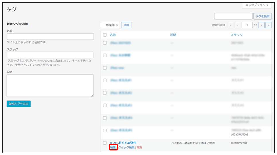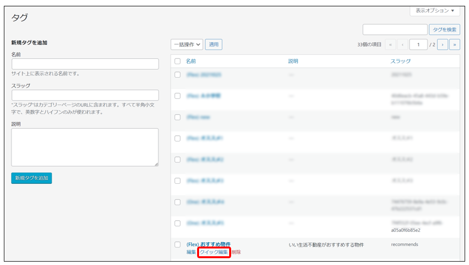 タグ一覧からクイック編集したいタグをホバーし、「クイック編集」をクリックします。