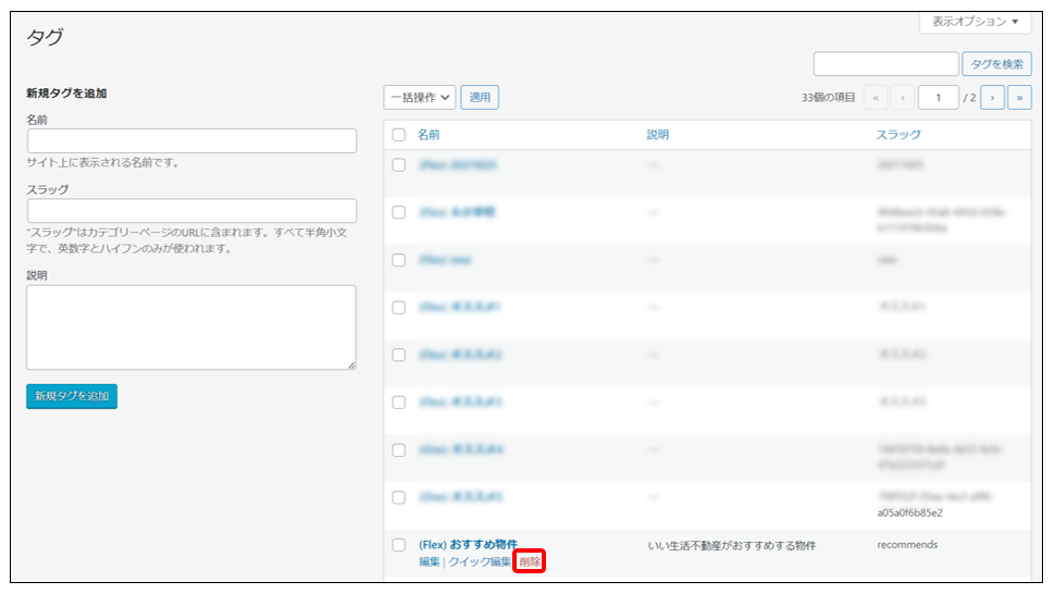 タグ一覧から、削除したいタグの行をホバーし「削除」をクリックします。
