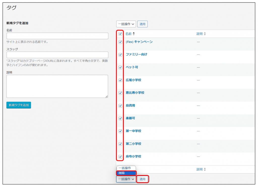 「一括操作」セレクトボックスをクリックで開き、「削除」を選択して、「適用」をクリックします。