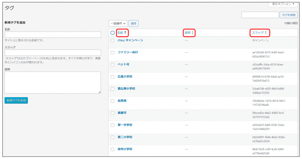 タグ一覧のテーブルヘッダのリンクをクリックすることでタグの並び替えができます。