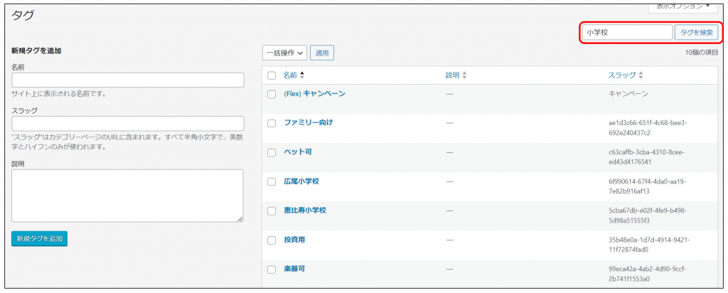 フリーワードでタグを絞り込み検索することができます。「名前」、「スラッグ」に検索ワードが含まれているタグを絞り込めます。