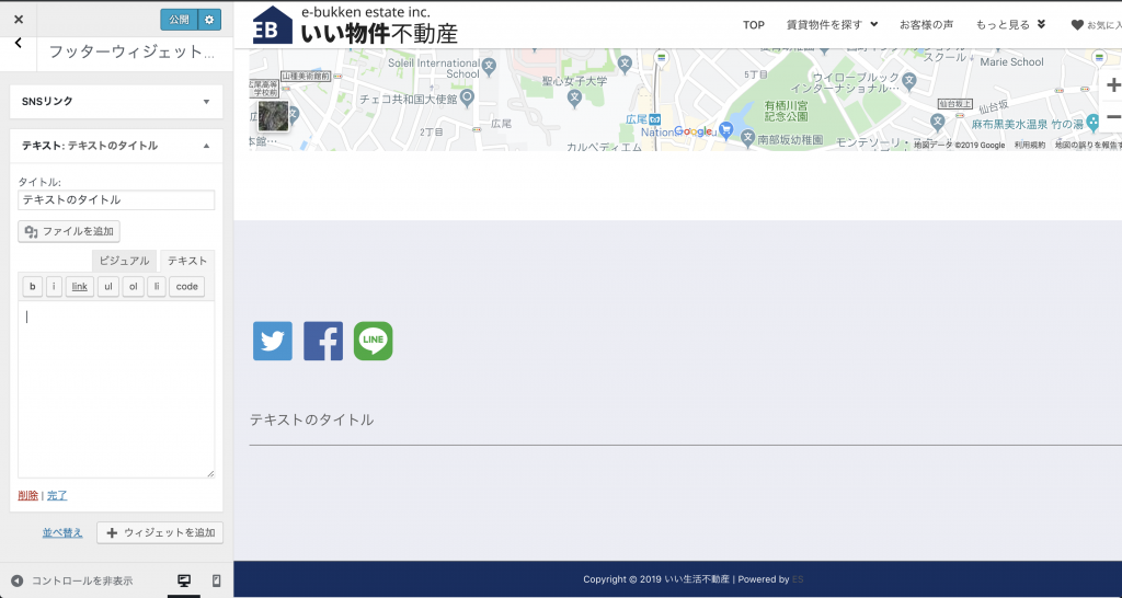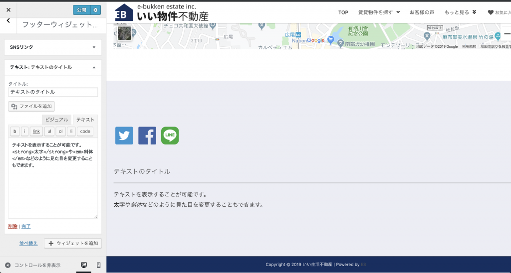 テキストウィジェットを使って、フッター等に文章を表示することができます。
