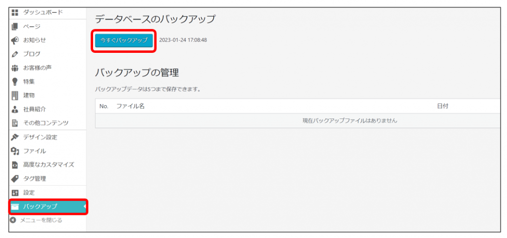「データベースのバックアップ」から「バックアップ」をクリックします。