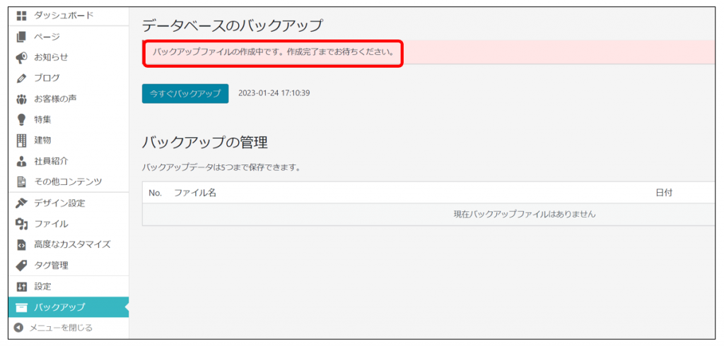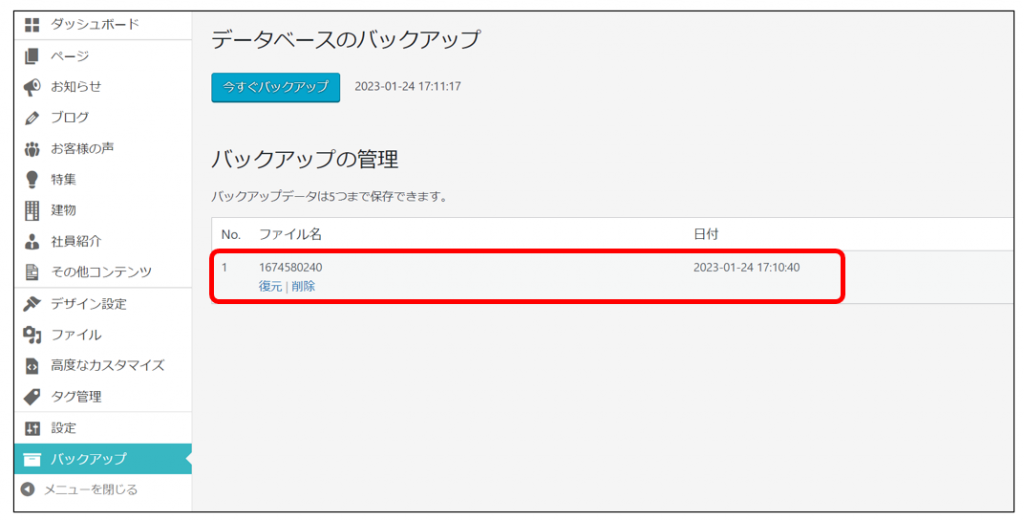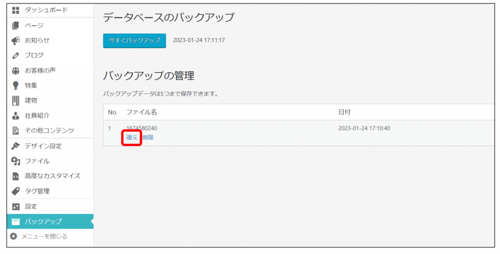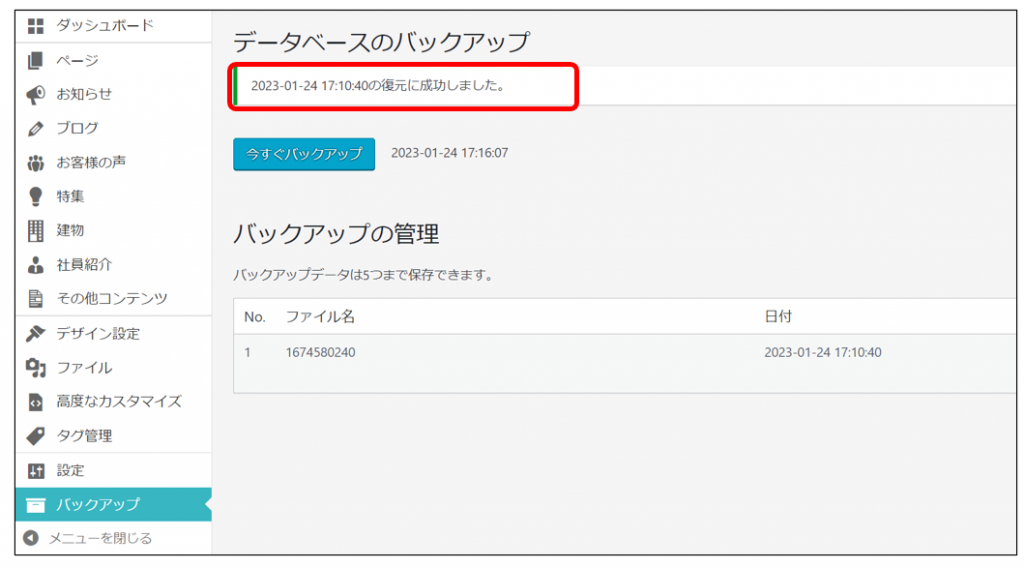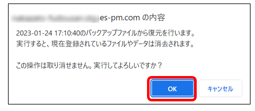 バックアップを復元するとバックアップ日時以降に作成したページやアップロードしたファイルは削除されますのでご注意ください。