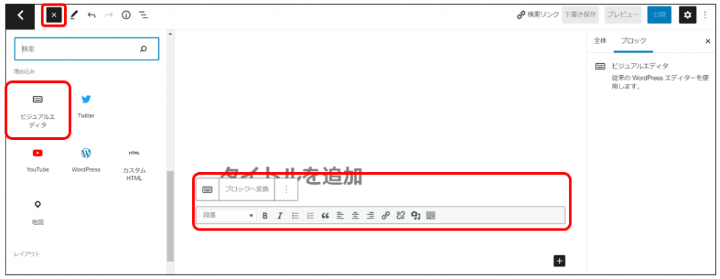 ブロックは埋め込み>ビジュアルエディタを選択することで追加できます。