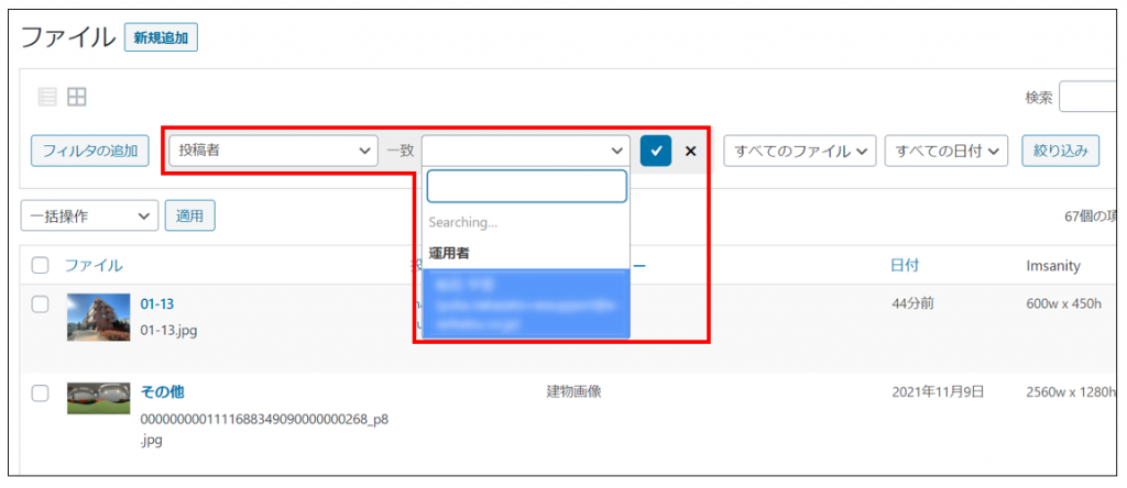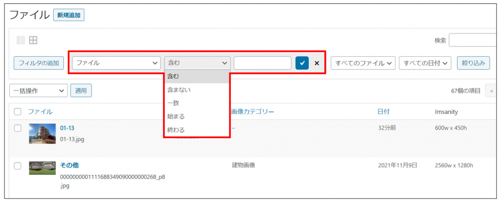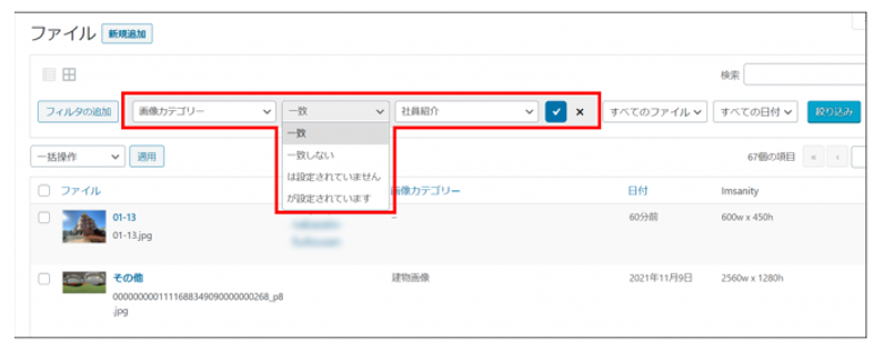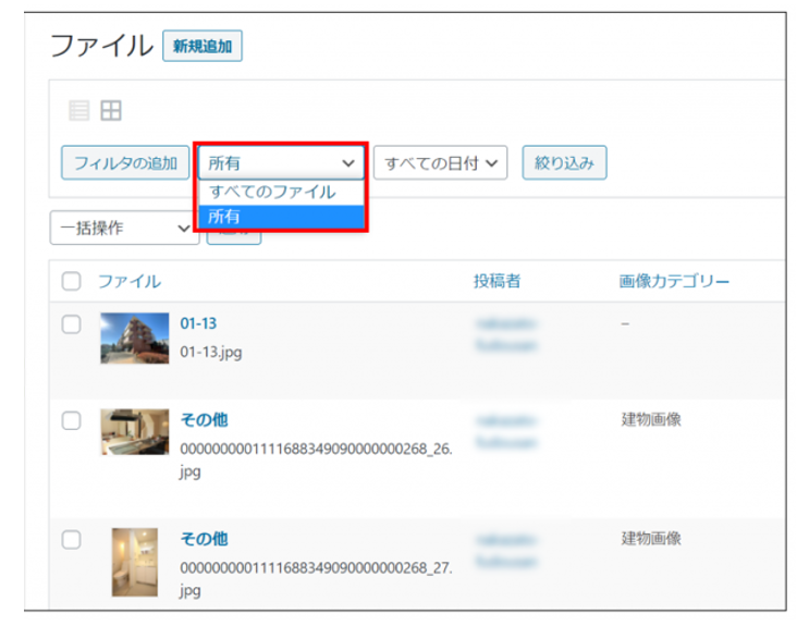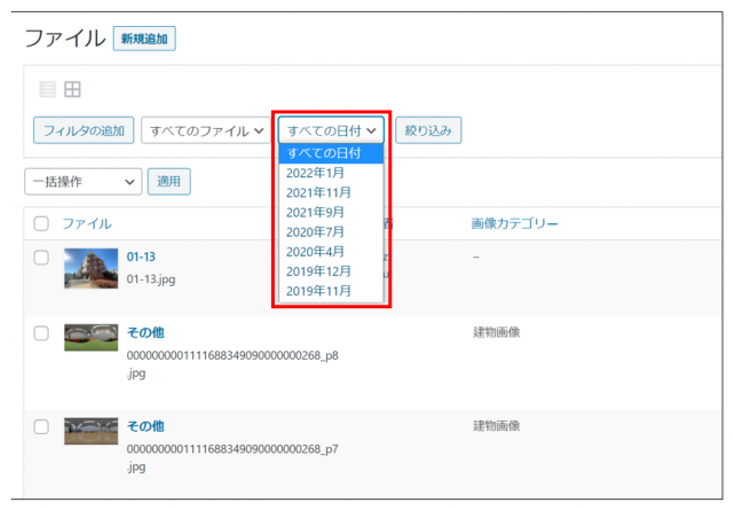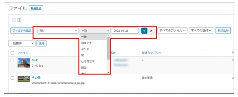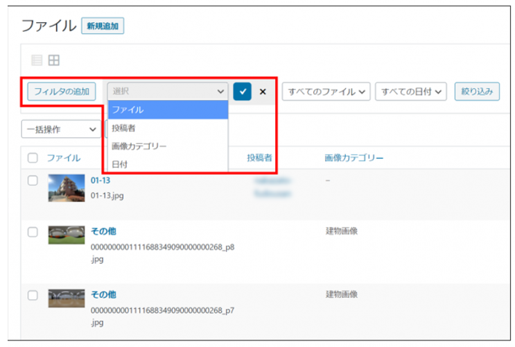「ファイル・投稿者・画像カテゴリー・日付」の選択肢が表示されます。
