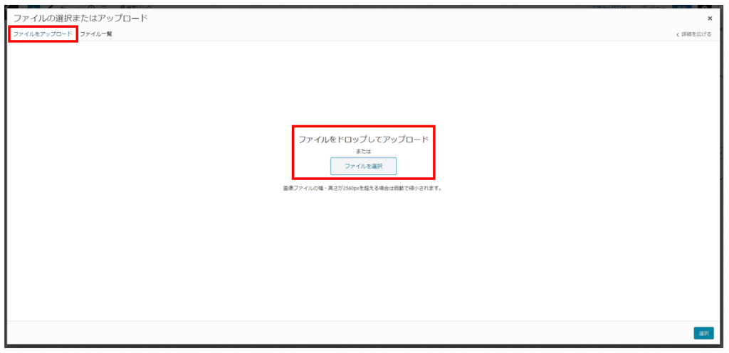 この時、「ファイルの選択またはアップロード」画面が表示され、