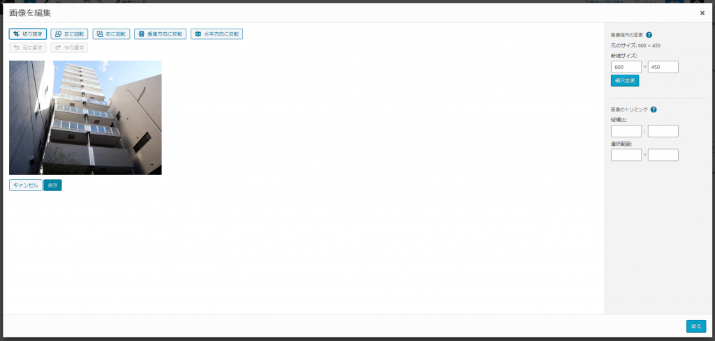 この画面では画像のトリミング・回転・反転・縮尺の変更ができます。