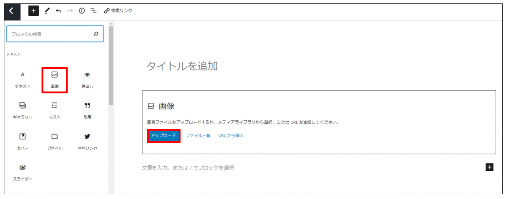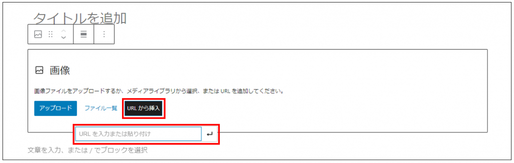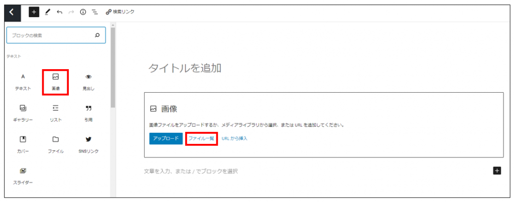 画像ブロックを配置し、「ファイル一覧」をクリックします。
