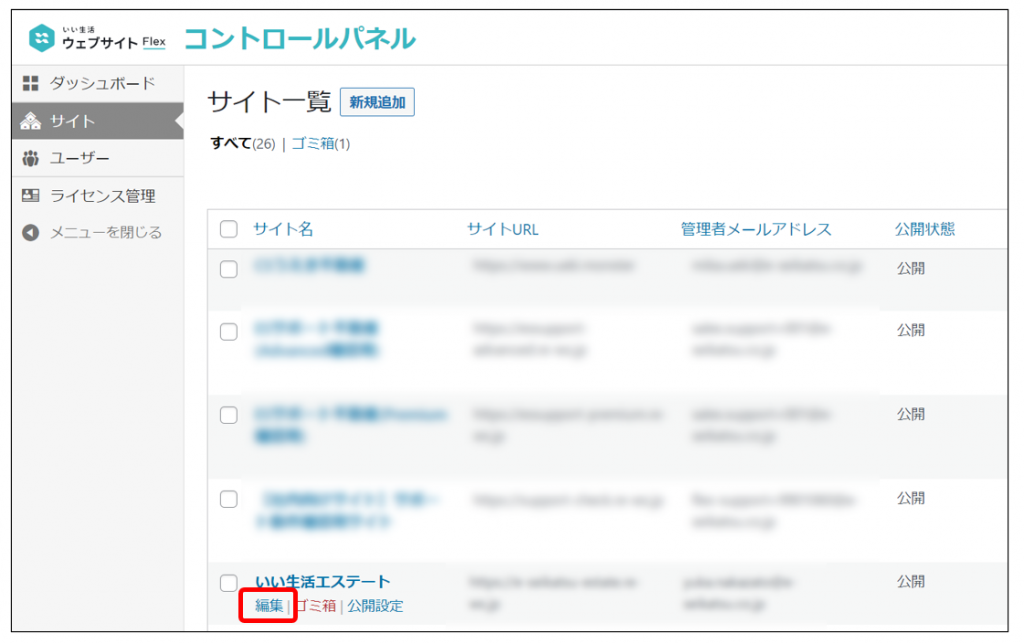②プラン変更を反映させたいサイトの「編集」をクリックします。