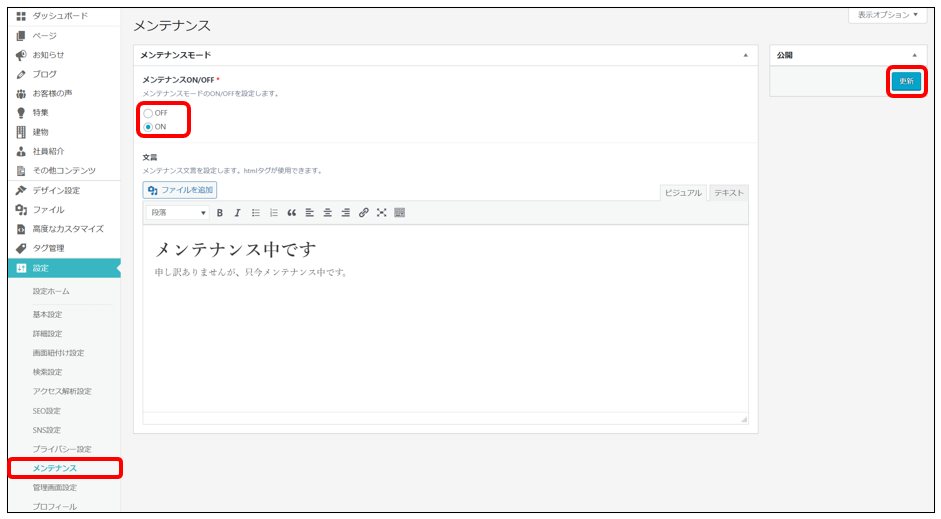 左メニューの「メンテナンス」よりメンテナンスモードのON/OFFを切り替えて更新してください。
