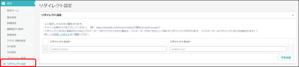 「行を追加」をクリックすると「リダイレクト元URI」と「リダイレクト先URI」の入力欄が表示されます。