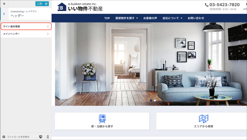 「ヘッダー」、「サイト基本情報」をクリックしてサイトの基本的な情報を編集することができます。