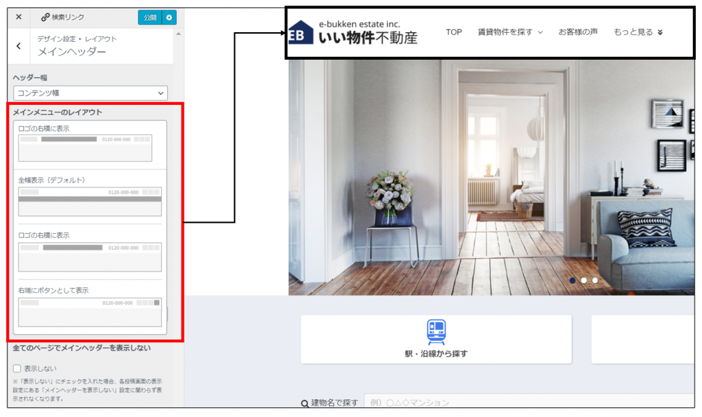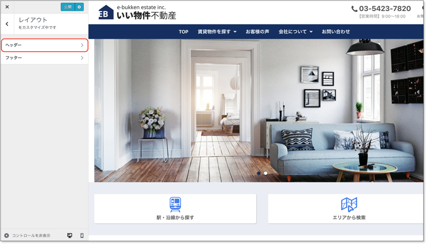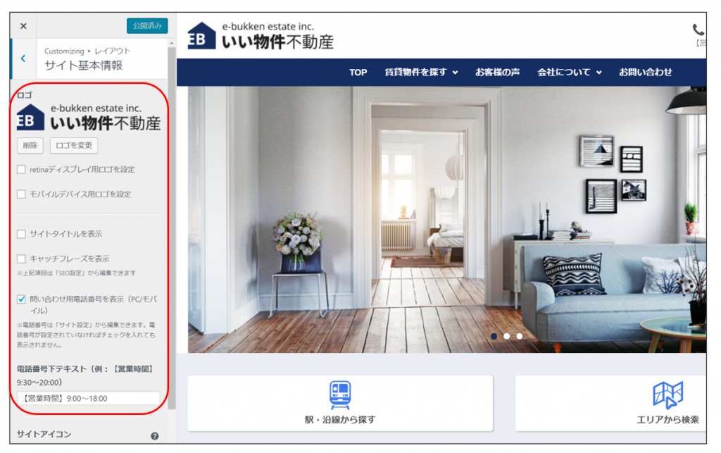 | 問い合わせ用電話番号を表示(PC/モバイル) | ヘッダーに問い合わせ用電話番号を表示するか設定します。 |