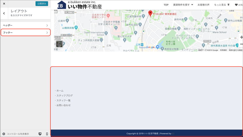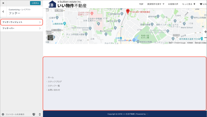 「フッター」、「フッターウィジェット」をクリックして、フッターウィジェットエリアのデザインを編集できます。