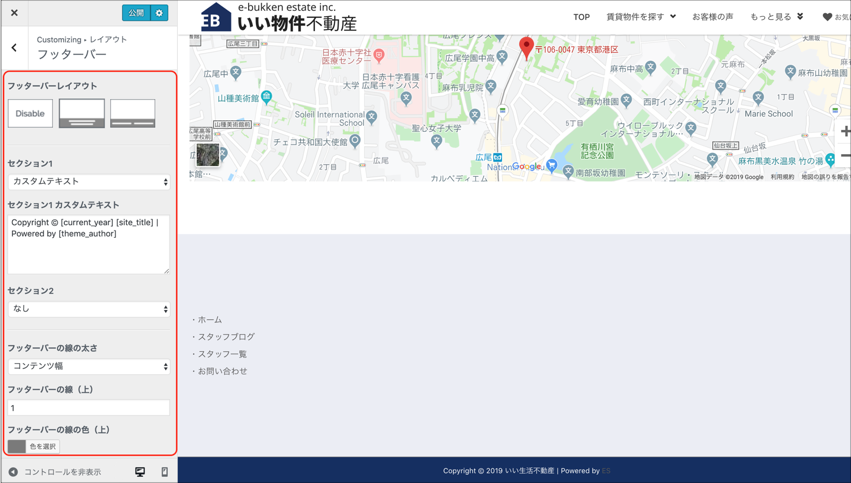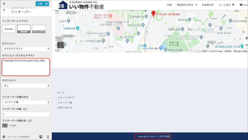 | セクション1 カスタムテキスト | セクション1に表示する文字です。 下記スニペットが使用できます。 ・[crrent year]: 現在の西暦を表示します。 ・[site_title]: サイトのタイトルを表示します。 ・[theme_author]: いい生活のサービスサイトへのリンクを表示します。 |