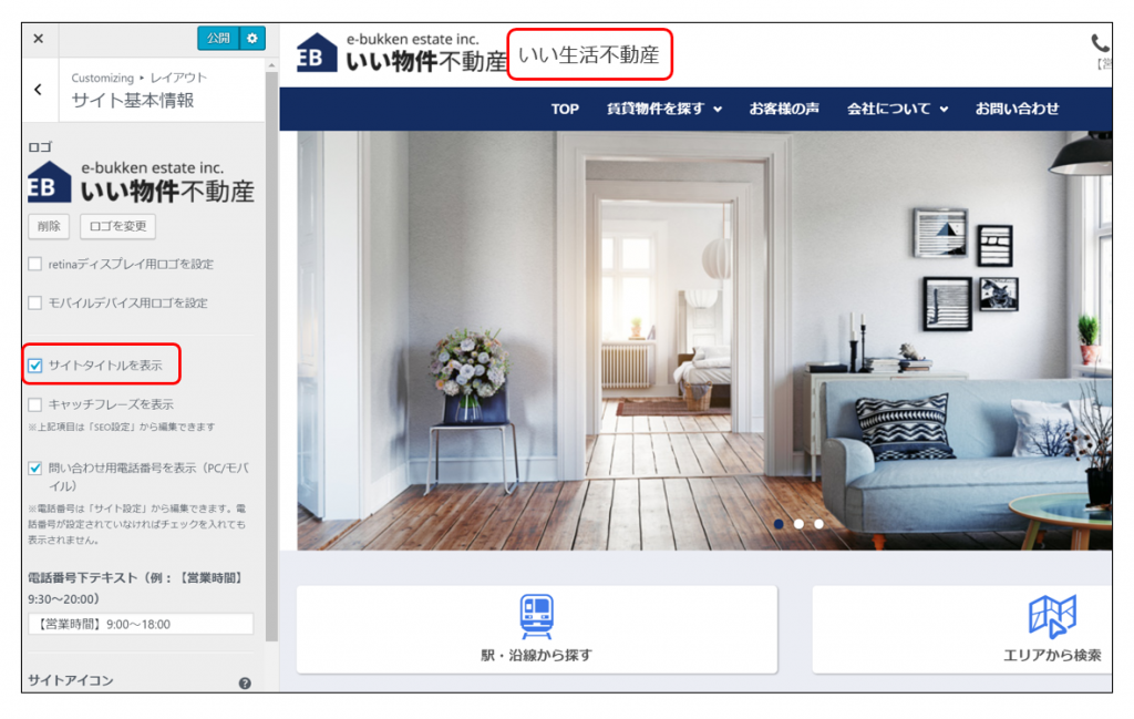 | サイトタイトルを表示 | チェックを入れるとサイトのタイトルを表示します。 サイトのタイトルは、SEO設定から編集できます。 SEO設定についてはこちら |