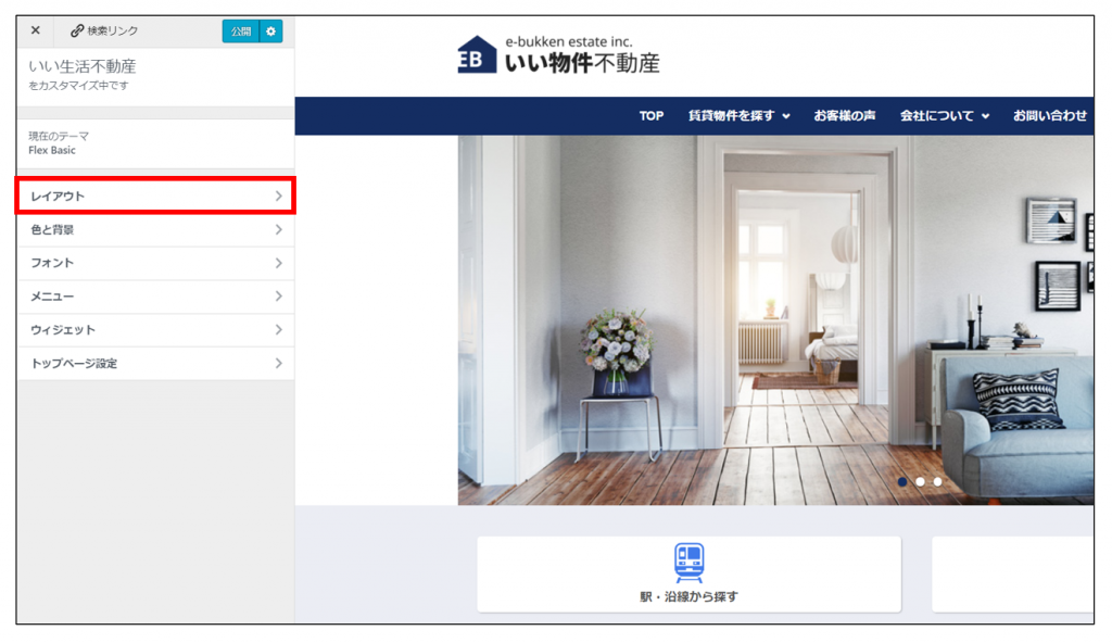 - サイドメニューから「デザイン設定」を開き、「レイアウト」をクリックします