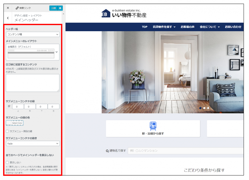 | ヘッダー幅 | ヘッダーの幅を下記から選べます。 ・全幅 ・コンテンツ幅 |