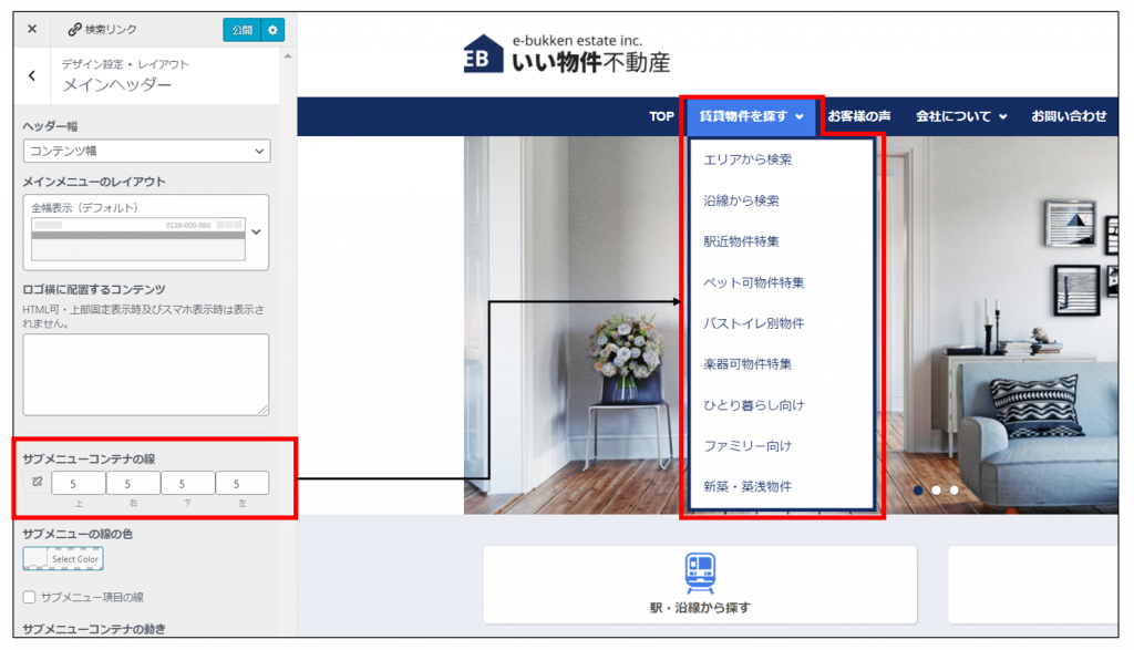サブメニューコンテナの幅では以下メニュー部分の幅を変更できます。