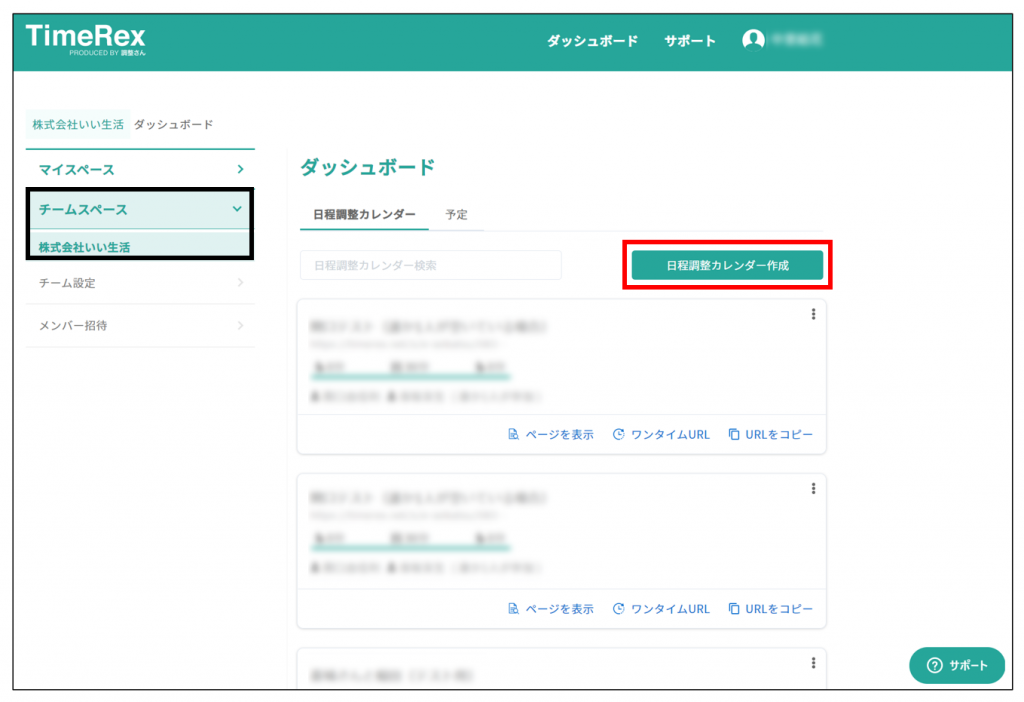 TimeRexにログインし、チームスペース>日程調整カレンダー作成をクリックします。