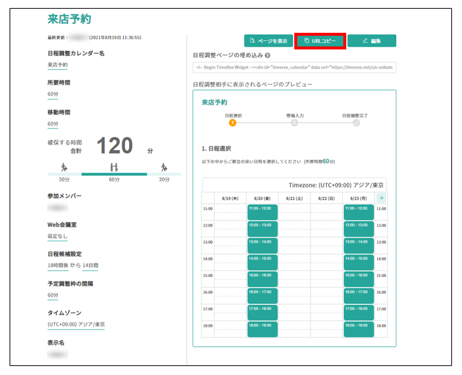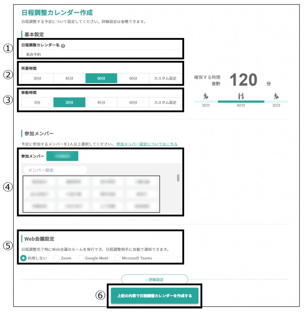 | ⑥上記の内容で日程調整カレンダーを作成する | 設定が完了したらクリックします。 |