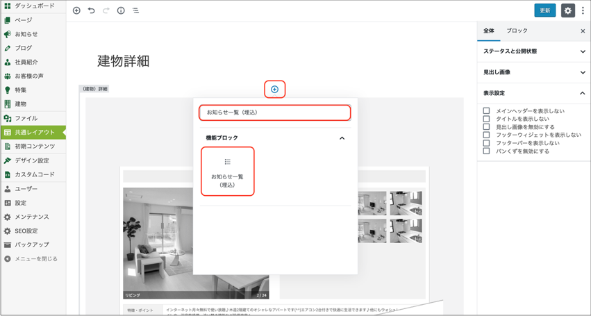 「建物詳細」の編集画面で「+」ボタンをクリックして、ページの最上部に「お知らせ一覧(埋込)」ブロックを配置します。