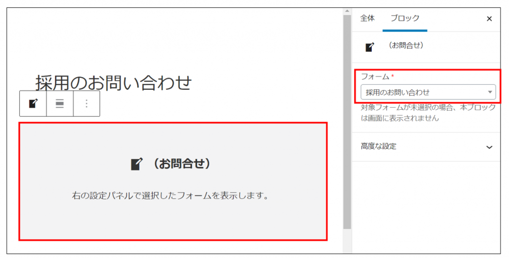 ⑥お問い合わせブロックを挿入し、ブロック設定で先ほど設定したフォームを選択します。