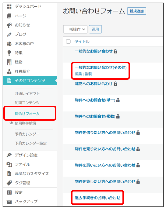採用などのフォームを作成する場合:「一般的なお問い合わせ(その他)」の編集or複製を押します。