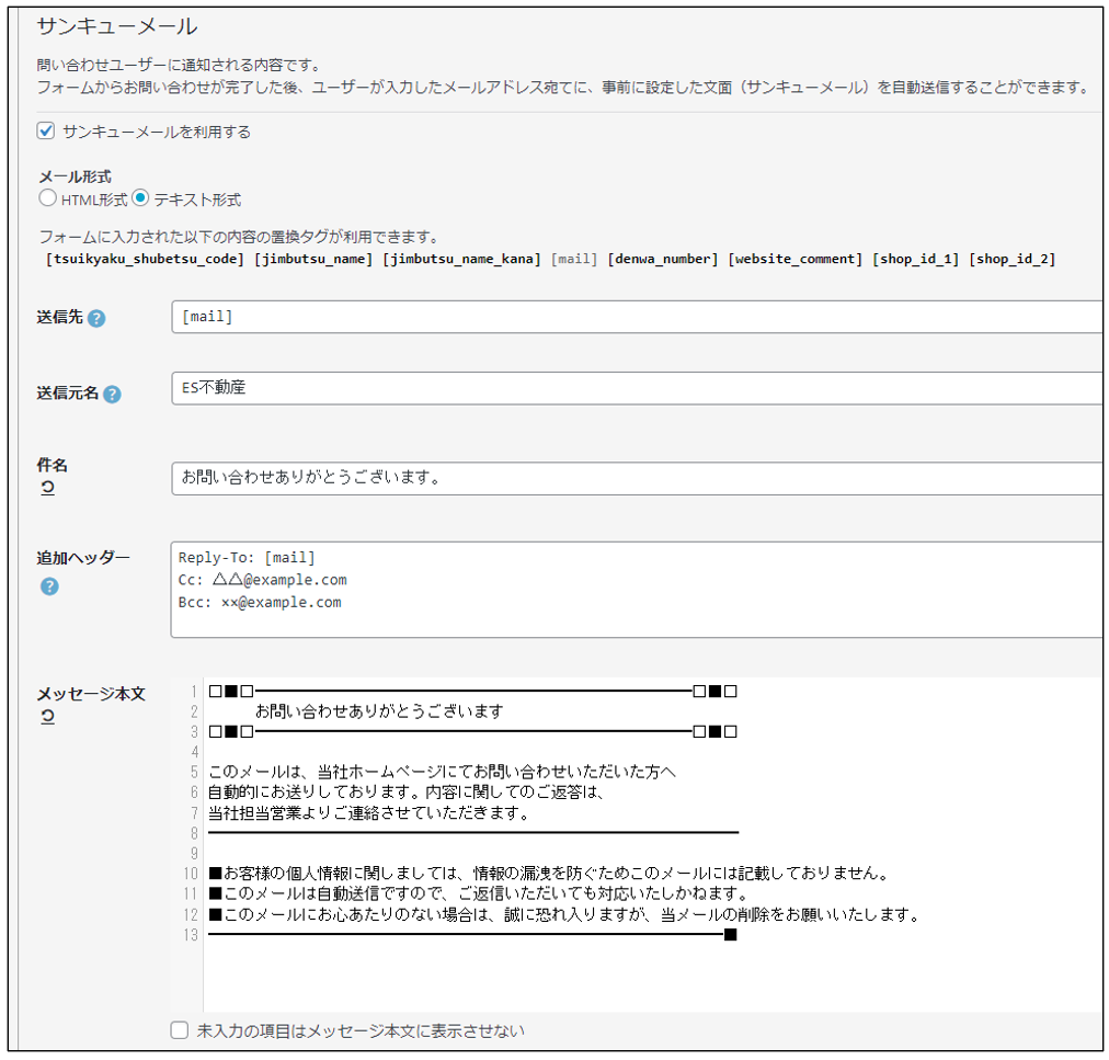 | 送信元名 | サンキューメールの送信元(From)の名称として表示されます。 記入例)〇〇不動産 と入力した場合、 From : 〇〇不動産 <noreply@es-pm.com> ※送信元のメールアドレスは固定です |