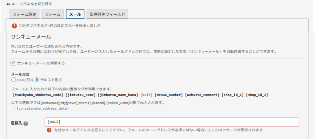 お手数ですが、フォームタブにて[email mail placeholder]を[email* mail placeholder]に変更し、