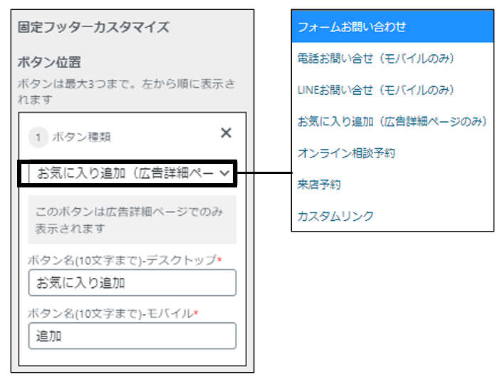 固定フッターのボタン種類、ボタン名等をカスタマイズできます。