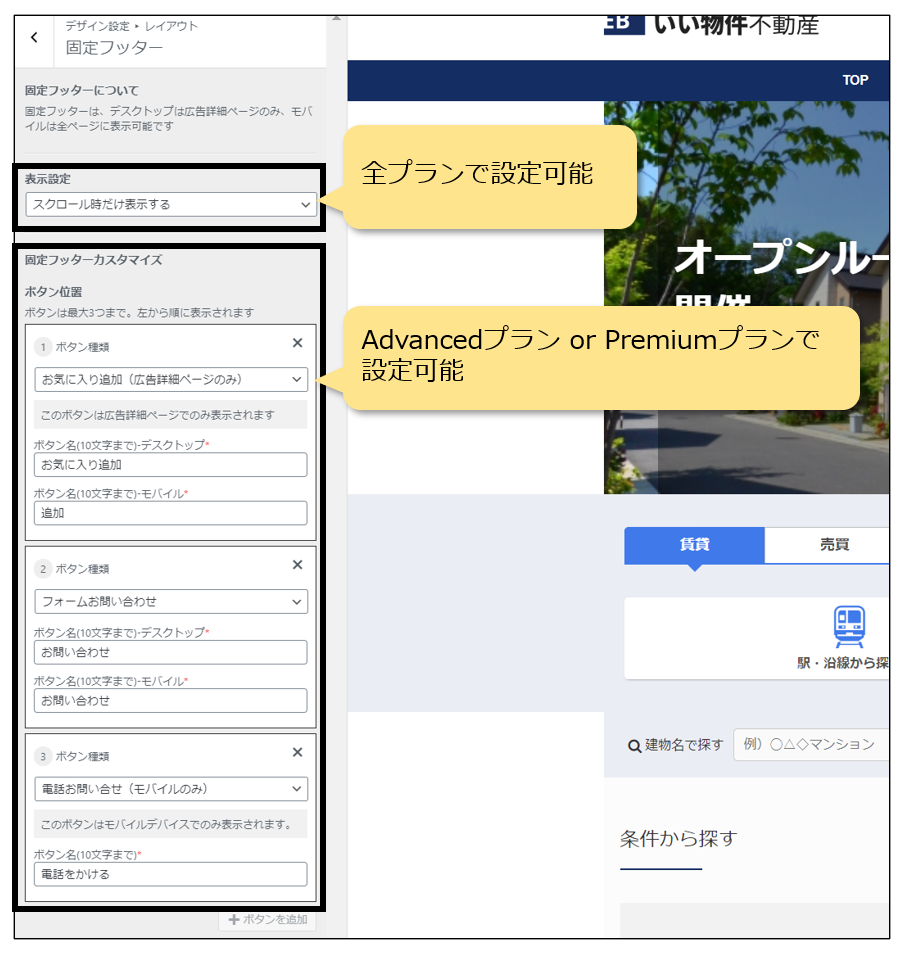 ※固定フッターの表示有無のみ全プランで設定可能です。