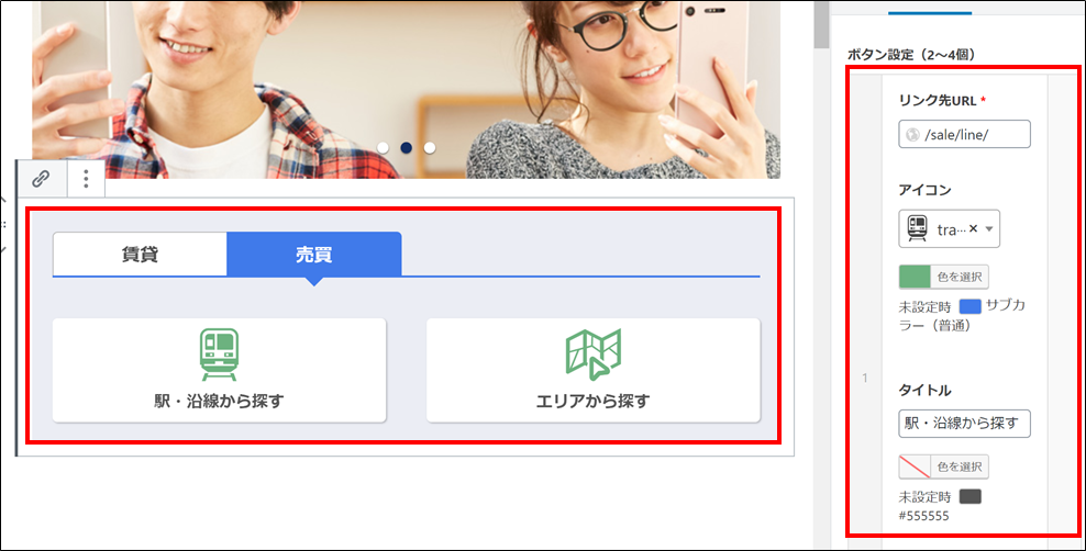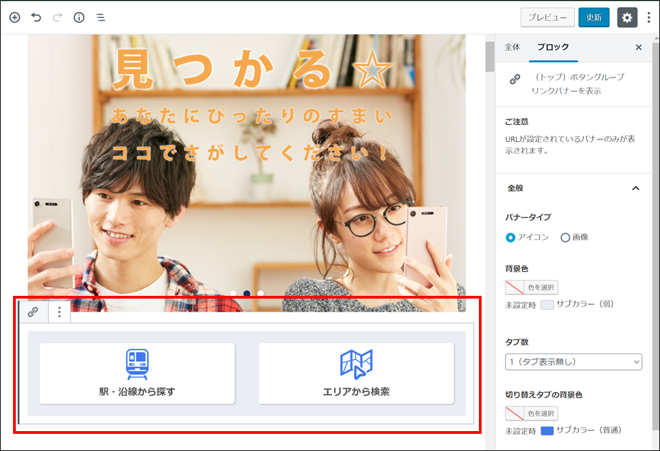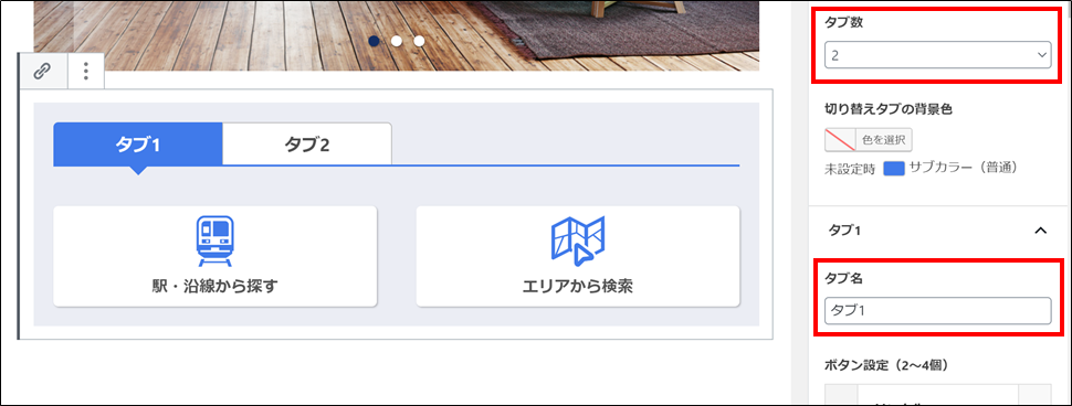 TOPページに配置されているブロックを選択からタブを追加し、売買用タブを作成します。